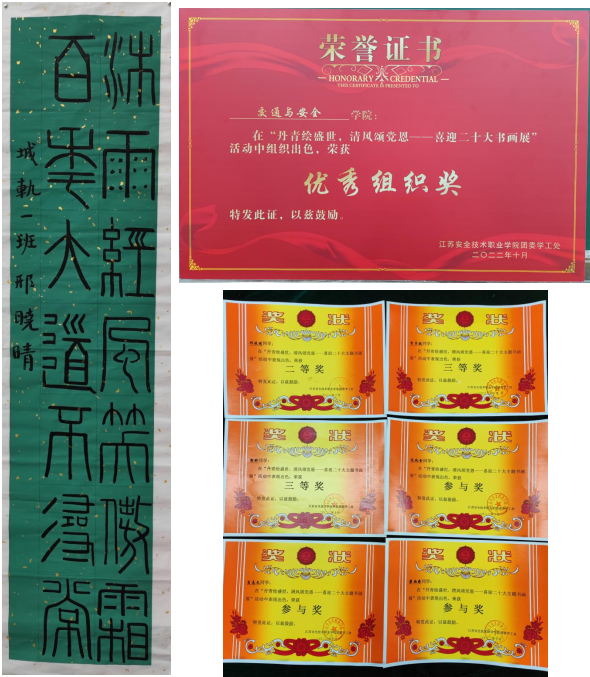 邢晓晴同学作品《翰墨颂风华》获二等奖;郭野同学作品《党旗如松》获三等奖;李子航同学作品《小桥流水人家》获三等奖;梁雨婷、陈政含、查志文同学作品获参与奖;交通与安全公司集体获“优秀组织奖”!