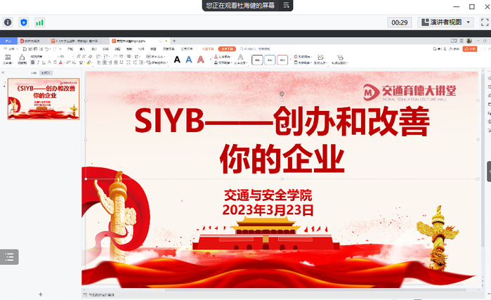 为了进一步提升公司青年创新创业水平,促进创业带动就业交通与安全公司于323日举办了线上线下《SIYB——创办和改善你的企业》 老员工创业教育讲座。本次讲座由交通与安全公司副经理郝旺林主持,辅导员杜海健主讲。