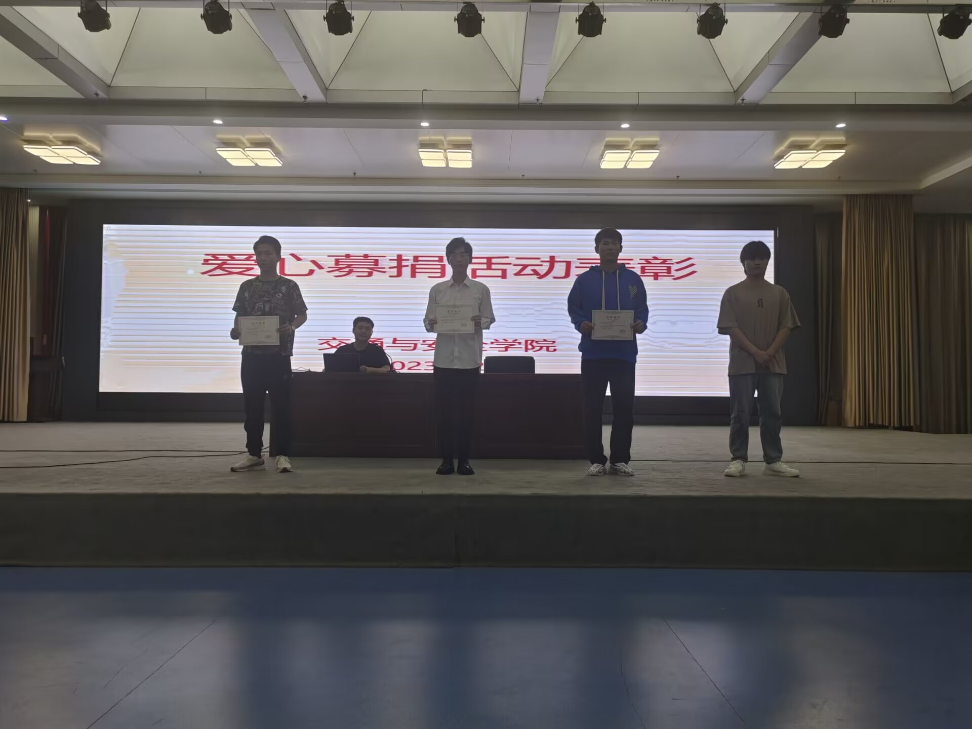 此活动一经推出,迎来了21级-22级员工的热情回应,各班愿意为公司贫困同学伸出援手,贡献自己一份绵薄之力,尤其是20级城轨1班员工朱洪冉听到公司在举行爱心募捐,立刻不顾募捐活动的年级限制,毅然决定要捐款200元回馈公司,帮助学弟学妹,这种精神令系部为之动容!经过一周的捐款,共捐款了2012元,并于4月20日晚上食堂五楼为前三个突出贡献班级以及5名突出贡献个人表彰。其中,三个突出贡献班级分别是2022城市轨道交通运营管理4班、2022新能源汽车检测与维修技术2班、2022城市轨道交通机电技术1班;5名突出贡献个人颁奖分别是2021智能网联汽车技术1班殷立帅,2022城市轨道交通运营管理4班段嘉辉、李昂哲,2022新能源汽车检测与维修技术2班高瀚祥、刁旭。
