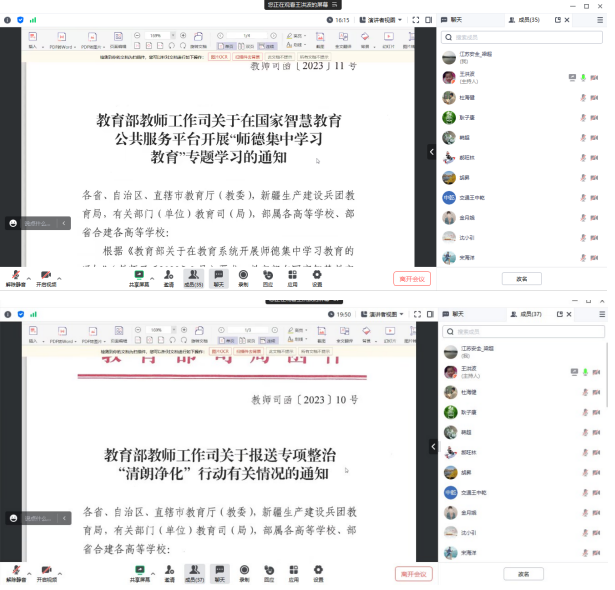 会议首先学习传达了全省高质量教育人才队伍建设暨师德师风工作推进会议精神、《教育部教师工作司关于报送专项整治“清朗净化”行动有关情况的通知》,然后按照《省教育厅关于开展师德集中学习教育的通知》精神,对照通知要求,对师德师风工作进行了再部署再落实。