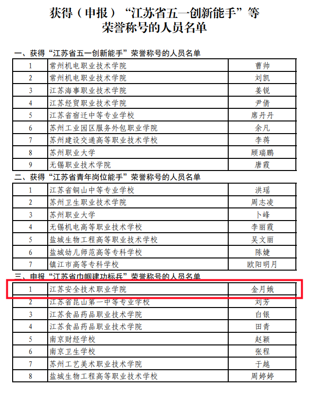 根据省教育厅、省总工会、共青团省委、省妇联《关于举办2023年江苏省职业院校教学能力比赛的通知》(苏教职函〔2023〕19号)安排,2023年全省职业院校教学能力比赛各项赛事已圆满完成。金月娥等8位同志由主办单位按程序向省妇联申报“江苏省巾帼建功标兵”称号。