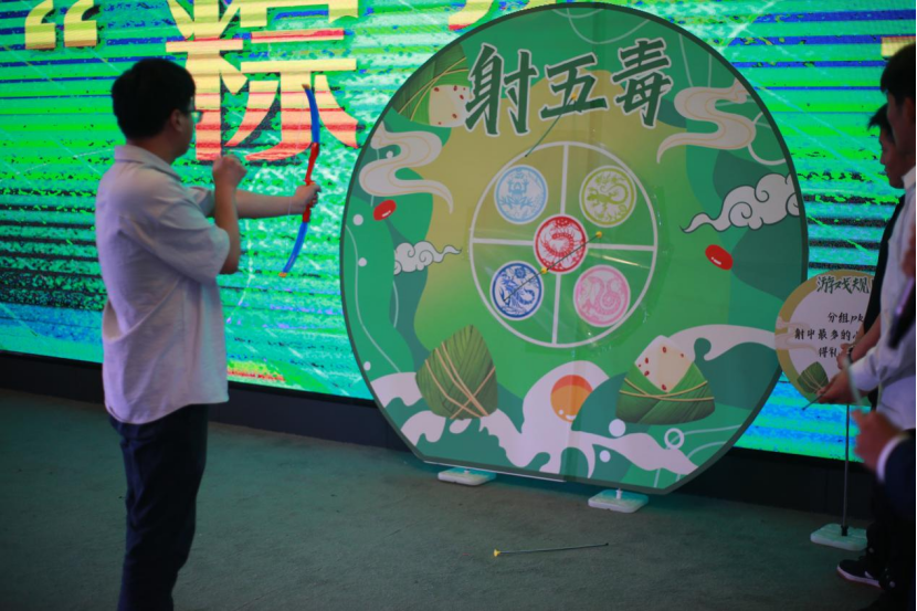 放“粽”一下。在放“粽”一下这个环节,我们设置了“射五毒”端午特色文化体验活动。(五毒指的是蝎子、蛇、壁虎、蜈蚣和蟾蜍,古人认为这些动物带有剧毒,是疾病和邪恶的象征。)射五毒,就是用弓箭射打五毒图案,寓意驱除疾病和邪恶,祈求健康和平安。