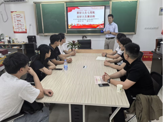 员工党支部组织委员张超以《党员干部要算好人生的“七笔账”》为题讲授专题党课,围绕“政治账、经济账、名誉账、家庭账、亲情账、自由账、健康账”,结合翔实的数据和真实的案例,引导毕业生党员常怀敬畏之心,以“一身正气、两袖清风”擦亮党员本色,算好人生大账,走好廉洁人生路。