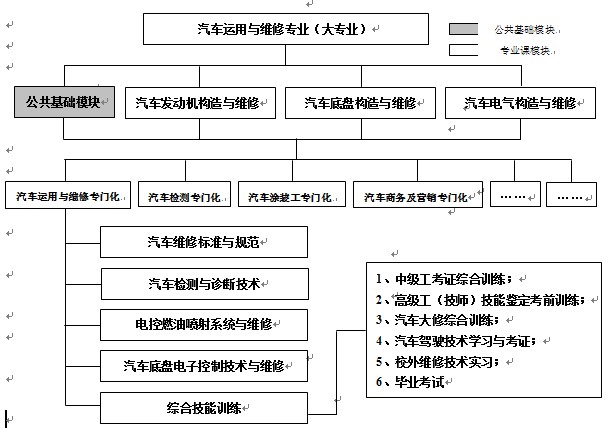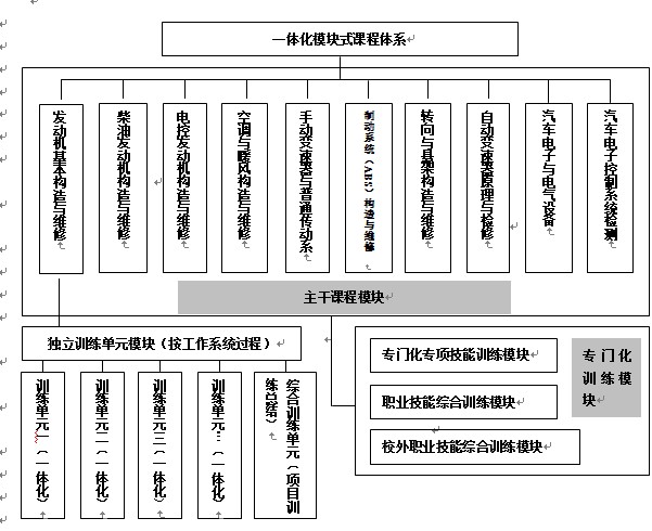 工作过程系统化课程体系应以员工为中心设计的,强调以员工直接经验的形成来掌握融合于各项实践行动中的新知识、技能和技巧。在教学过程中,员工对所学的专业内容和工作环境先有一个感性认识,以此来获得与工作岗位(群)相关的知识,然后再学习专业知识。员工获得知识的过程始终都与具体的职业实践相对应。同时,工作过程系统化课程是案例性、经过系统化教学处理的行动领域。每一个学习领域是一个学习课题,通过一个领域的学习,员工可以完成某一职业的一个典型的综合任务,通过若干个相互关联的学习领域的学习,可以获得某一职业的从业能力和资格。基于上述理论,便于教学的组织和实施,以及理论实践一体化教学的开展,提高员工学习的兴趣,将汽车运用与维修专业的主干课程(汽车发动机构造与维修、汽车底盘构造与维修、汽车电气设备构造与维修)进行全面的调整和整合,全面构建“宽基础、活模块”、工作过程系统化课程体系。由10个学习模块(如图2)组成为主干的专业课程体系。在组织实施教学过程中,公司可以根据不同企业对人才的需求变化,优化模块的组合和专门化课程的学习,以满足企业对人才的要求。