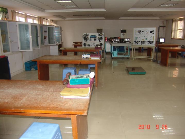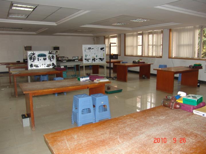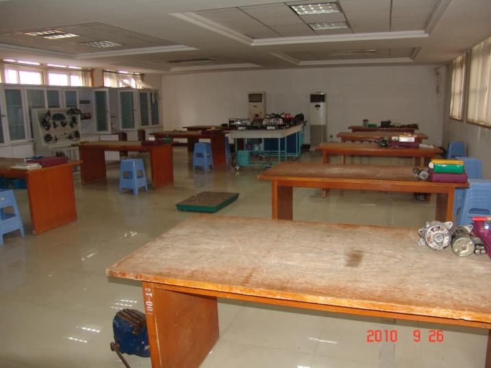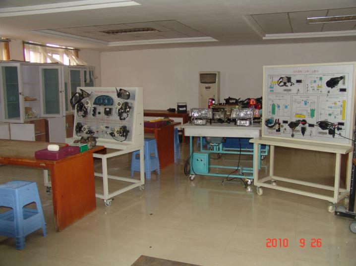 电气设备实训室主要进行电气设备理实一体化教学,包括发电机、起动机、蓄电池、整车电路和空调系统等教学