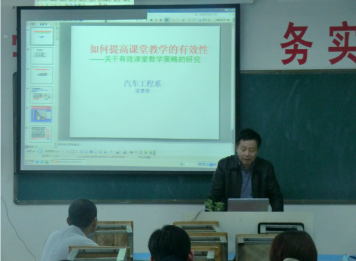 | 为进一步提高教师的学术交流水平,丰富学术交流的内涵,我系于10月31日下午继续开展学术交流讲座,由基础课教研组长段景华副教授主讲,系主任佟廷友、教学主任温俊芳及全体教师参加。 段老师所讲的主题是“如何提高课堂教学的有效性——关于有效课堂教学策略的研究”。讲座共有四个大的议题,一是课堂教学有效性的判定;二是教师教学的无效与有效行为;三是能有效教学的教师素养;四是增强教学有效性的几点意见。通过四个内容的阐述,阐明了教师应如何上好课,提高课堂教学的效果,“用心”做一个高效的教师。 讲座的开展,让全体教师尤其是青年教师对课堂教学有效性有了明确的认识,对以后的教学工作以及如何做一个高效的教师有很大的指导作用。 文/图:周旺红  |