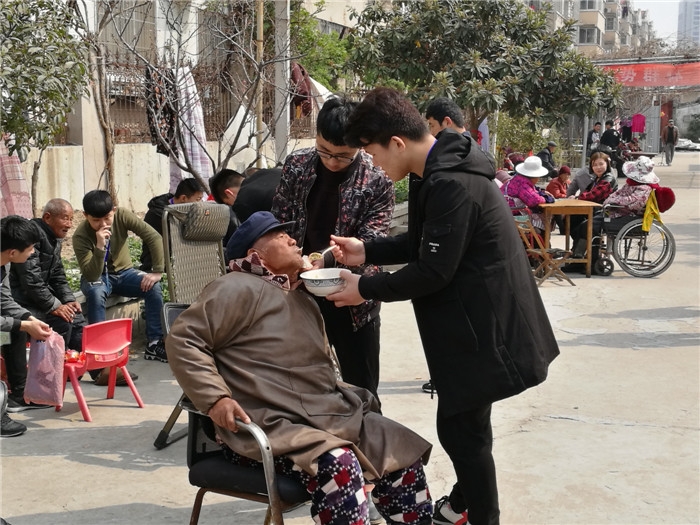 为了给老人们一顿可口的午餐,志愿者和老人们一起包水饺,忙的不亦乐乎,看着老人们吃着自己包的水饺,大家心里充满了满足感,对于一些生活不能自理的老人,志愿者们喂饭给他们,暖暖的温情永远留在了老人的心间。