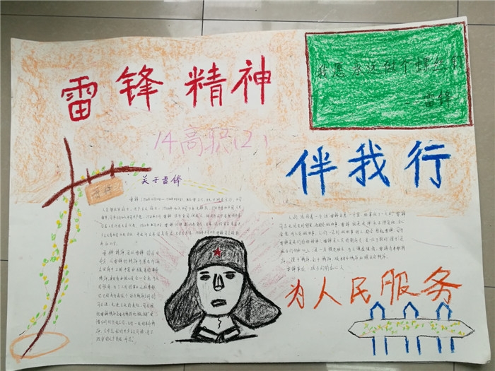 活动中,同学们收集雷锋的生平事迹,雷锋故事、雷锋名言等资料,以雷锋肖像、雷锋日记、雷锋故事、名人题词、学雷锋感悟等为主要表现内容。手抄报主题鲜明突出、版面设计精美、文字图画优美生动、色彩搭配充满创意,绘画生动形象、惟妙惟肖,充分表达了对雷锋同志的深深敬意。