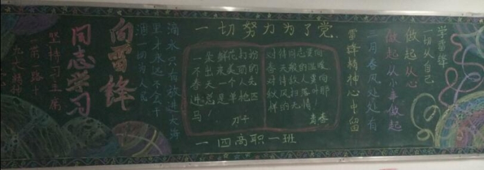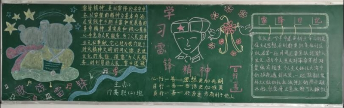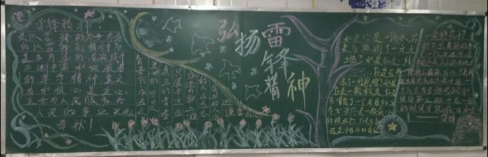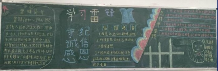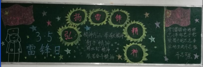 各班充分利用黑板报这块宣传阵地,对雷锋的生平事迹进行了全方位的报道,让本班同学能充分了解雷锋,学习雷锋,传承雷锋精神。黑板报内容有的介绍雷锋的生平;有的宣传雷锋的感人事迹;有的再现雷锋日记;有的收集雷锋名言录。形式多样,内容丰富多彩。