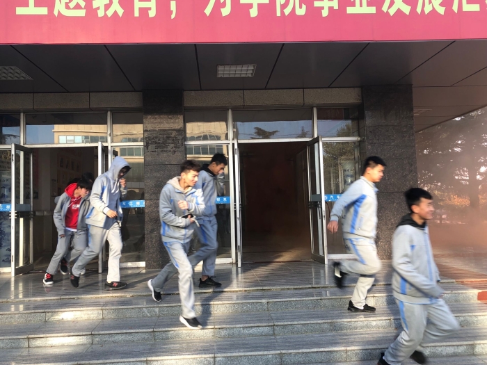 演练活动共分为两个环节:第一环节防火演练信号发布后,同学们在员工会成员及相关老师的组织下按照指定路线迅速撤离到安全区域。到达安全区域后,由各班长清点人数,并向系领导汇报。演练共用时5分钟。第二个环节,员工在安全区域按照班级顺序集合完毕后,由团支部书记张允志向同学们讲解在火灾发生时如何正确逃生以及一些自救成功的案例。