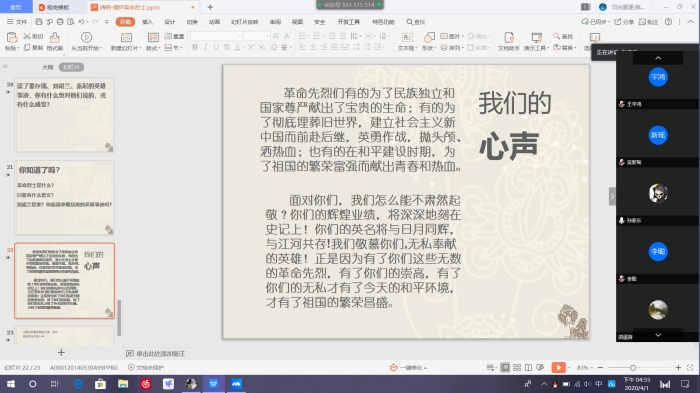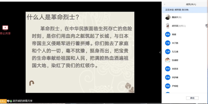 通过此次线上主题团课,同学们不仅学习了革命先烈们大无畏的英雄气概,更领悟到今日的幸福生活的来之不易,受到了深刻的爱国主义教育。