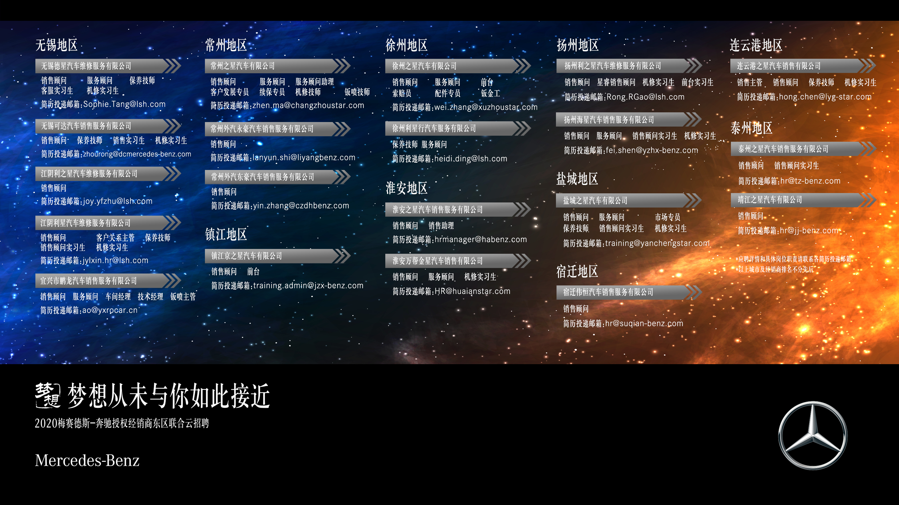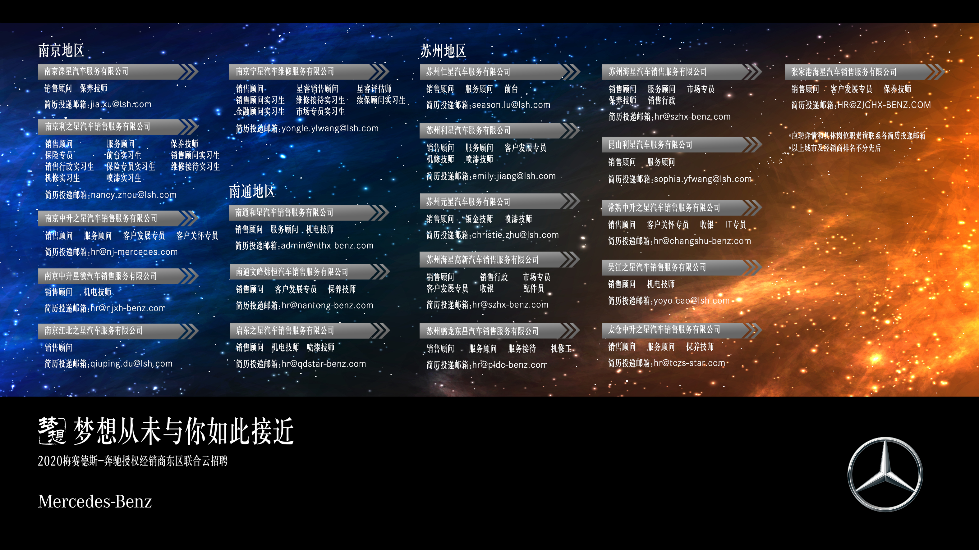 2020年梅赛德斯-奔驰东区经销商联合云招聘-江苏专场正式起航想去美丽江苏的哪个城市发展?我们助力你开启“奔驰”人生星徽闪耀,未来可期!
