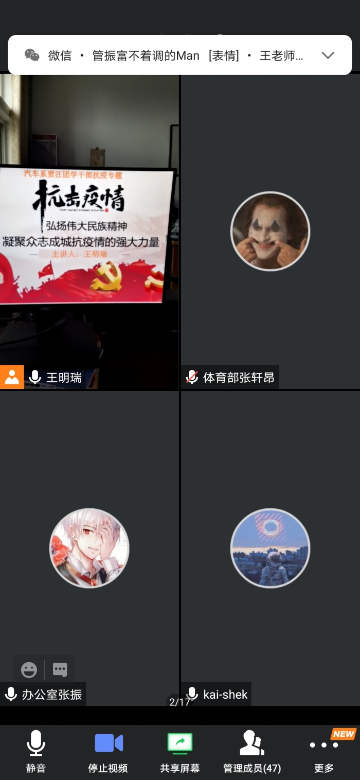 逆势而上、逆风飞翔,夯实基础、勇于担当。为进一步做好疫情防控工作,汽车系贾汪校区开展疫情中期团学干部培训,会议于2020年7月5日在腾讯会议,会议由学管老师王明瑞主持,72名团学干部参加会议。