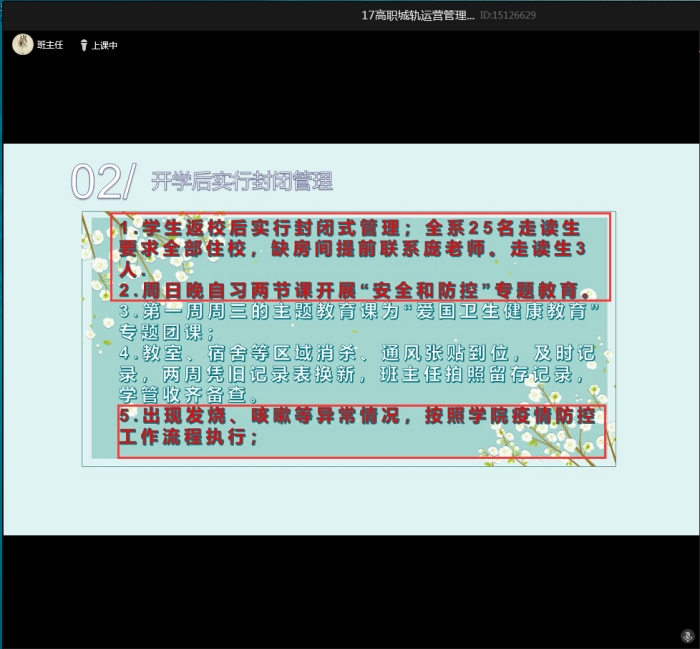 班主任根据系部要求及时传达公司1、开学前的疫情防控,疫情防控进入到关键的收尾阶段,所有员工按要求填报体温,及时上报行程码,返校员工要提供健康卡;2、开学后实施封闭管理,所有员工无特殊不允许离校,有特殊情况的按流程离校;3、征兵数据汇总,凡是征兵的班级按要求填报信息;4、意识形态正面引导,树立正确的安全意识,不传谣不信谣,坚守安全底线;5、关注员工心理健康,由于疫情放假时间特别长,员工长期在家,缺少相关心理辅导,发现心理异常的及时上报,联系公司心理咨询老师;6、文明创建、廉政教育、安全教育,徐州市文明城市复检工作,应知应会要求每个人都要掌握,班主任做好廉洁自律工作,不得接受员工礼品、宴请等,班主任召开班会做好安全教育工作,增强员工自我安全保护意识,提升员工的安全防护能力。