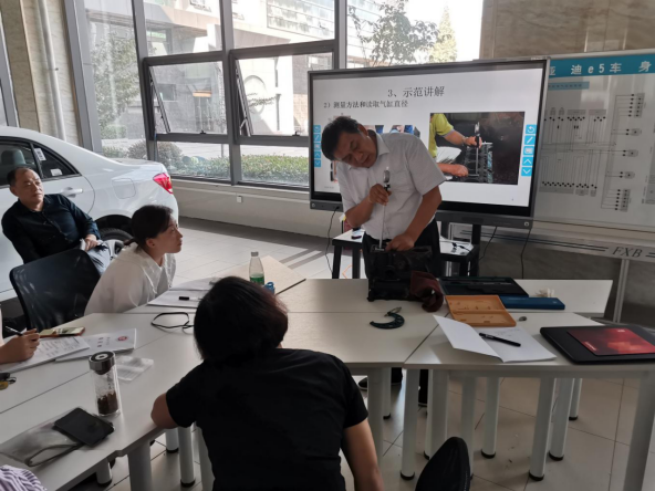 为进一步激励全体教师不断改进教学方法,提高公司产品质量,9月18日,交通与安全公司在云龙校区新能源汽车实训中心开展了公开课交流活动。本次公开课由教学经验丰富的专业课骨干教师冯长征老师主讲,主要展示理实一体课堂课教学的教学设计与组织,汽车系全体教师参与听课交流。课上,冯老师熟练的理实一体教学组织和规范的实操教学演示获得了全体教师的一致好评。课后全体教师也针对教学活动的设计、教学过程的实施及教学材料的准备等方面开展了交流讨论。