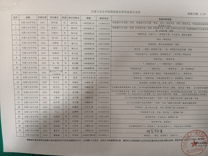 交通与安全公司2020年度国家励志奖学金拟定名单