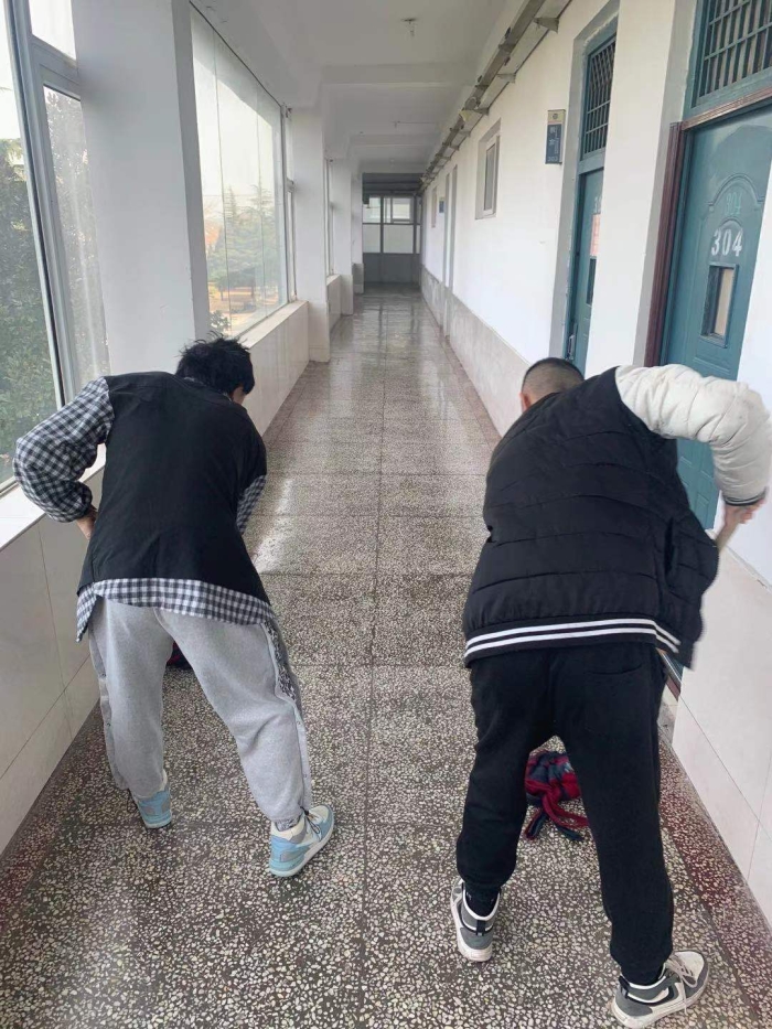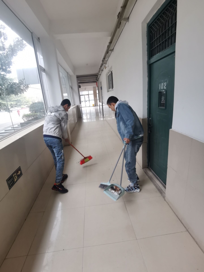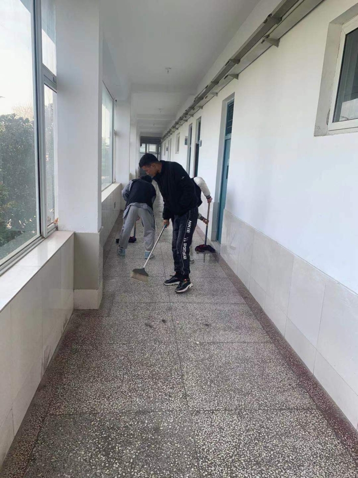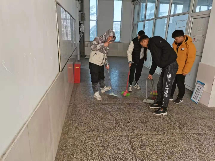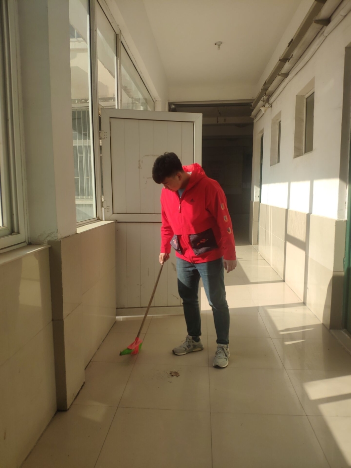 上午9时,志愿者在班主任高燕老师的指导下,开展卫生大扫除。经历一个寒假,整个教学楼都在灰土的掩盖下显得又脏又乱。30个小伙子,来自多个民族,经过近三个小时的努力,整个教学楼焕然一新,地板反射出阳光,让人感觉那么温暖舒适。