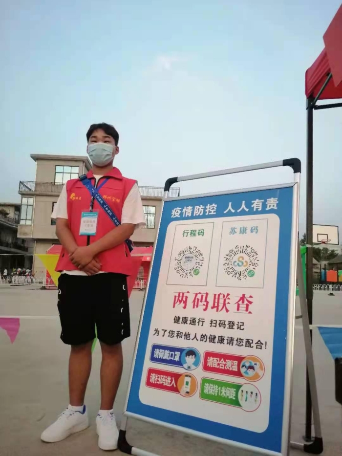 疫情防控,志愿先行。19汽车美容1班的郭运,共青团员,在疫情期间积极参与志愿者防疫活动,在镇西小学西侧广场帮助本村的人进行体温测量和登记核酸检测。