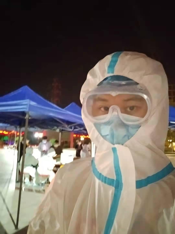 第一天他被派到村口卡点,工作人员教他如何使用测温枪,如何查看电子登记信息、登记外来车辆信息,站岗、拦车、测温、记录丝毫不敢懈怠。每天晚上整理大家的体温信息到凌晨,第二天再去防疫站工作。虽然天气很热,也很枯燥,但看到村民对他的问候及竖起的大拇指就会让他觉得一切都是值得的。在连续一周的早出晚归防疫站卡点工作后,村里又开展了全民核酸检测工作。他又一次主动请缨,穿上厚厚的防护服、带上橡胶手套、防护眼镜、厚厚的帽子、口鼻罩,套上过膝的脚套转战核酸检测工作。由于没有医护工作经验他主要负责核酸检测者的信息录入工作。刚开始工作很不适应,天气非常炎热,他们的检测地点在村口附近的广场。早上六点半就要穿上密不透气的防护服一直到晚上十一点。但回忆起武汉那些白衣天使们他这点又算得了什么呢?调整后继续加入战斗,由于物资缺乏他们只有在中午轮班吃饭的时候才能上个厕所换下身上早已被汗水浸透的防护服。一天不敢喝水因为上厕所就要换衣服,换衣服就意味着物资的浪费。眼睛被防护眼镜勒出深深的印痕,防护眼镜上一层层的汗水辣的眼睛睁不开。口罩每2小时就要换一次,因为天气太热口罩早已被汗水浸湿,为期三天做完了全村包括外来人员近5000人的核酸检测,此时的他们才稍稍放松下来,也让他切实感受到了医护工作者的艰难。