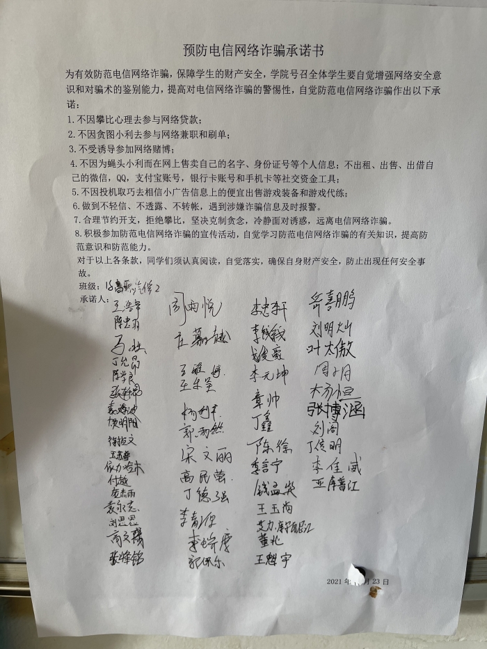 为维护公司师生权益,做好有效防范,提高老员工针对电信诈骗犯罪的识别和应对能力,根据学管主任邓主任要求,公司现开展每人以班级为单位签署一份防范电信诈骗承诺书的活动。