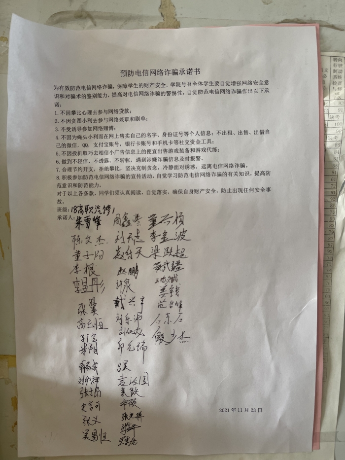 公司全部740名在校员工在11月23日的晚自习参与了签署,从根本上提高员工的防范意识,全面落实打防管控措施,坚决遏制电信网络诈骗犯罪多发高发态势。