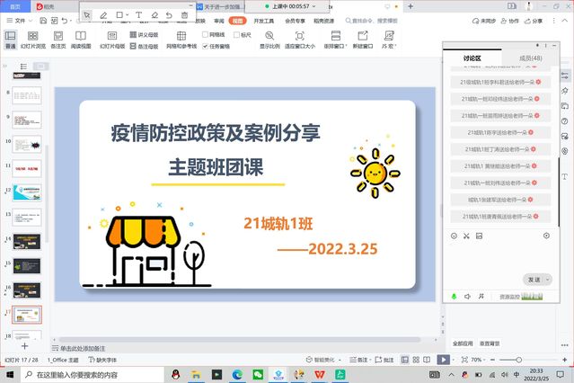疫情当下,为深入贯彻习近平总书记重要指示精神,进一步从严从紧、科学精准做好高校疫情防控工作,坚决守护校园防疫战线,结合公司实际情况,3月25日,交通与安全公司各年级、各专业开展加强疫情防控教育线上主题班会,公司全体员工参会。